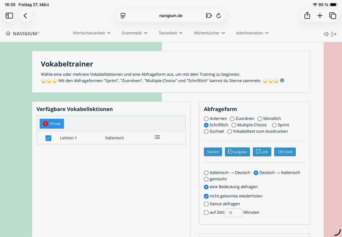 - Vokabeltrainer mit vielfältigen Abfrageformen zum selbstständigen Lernen